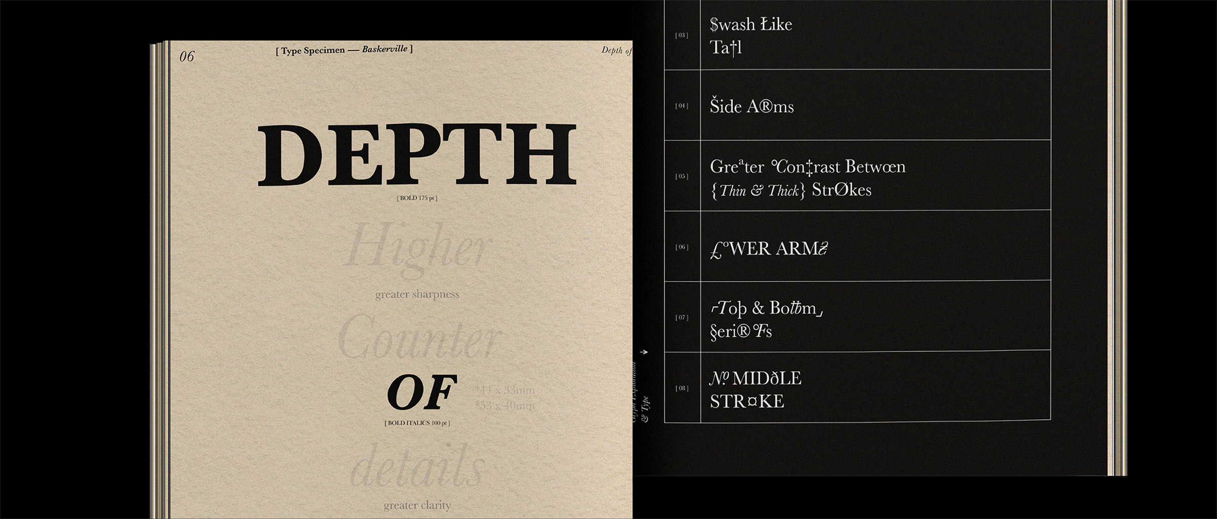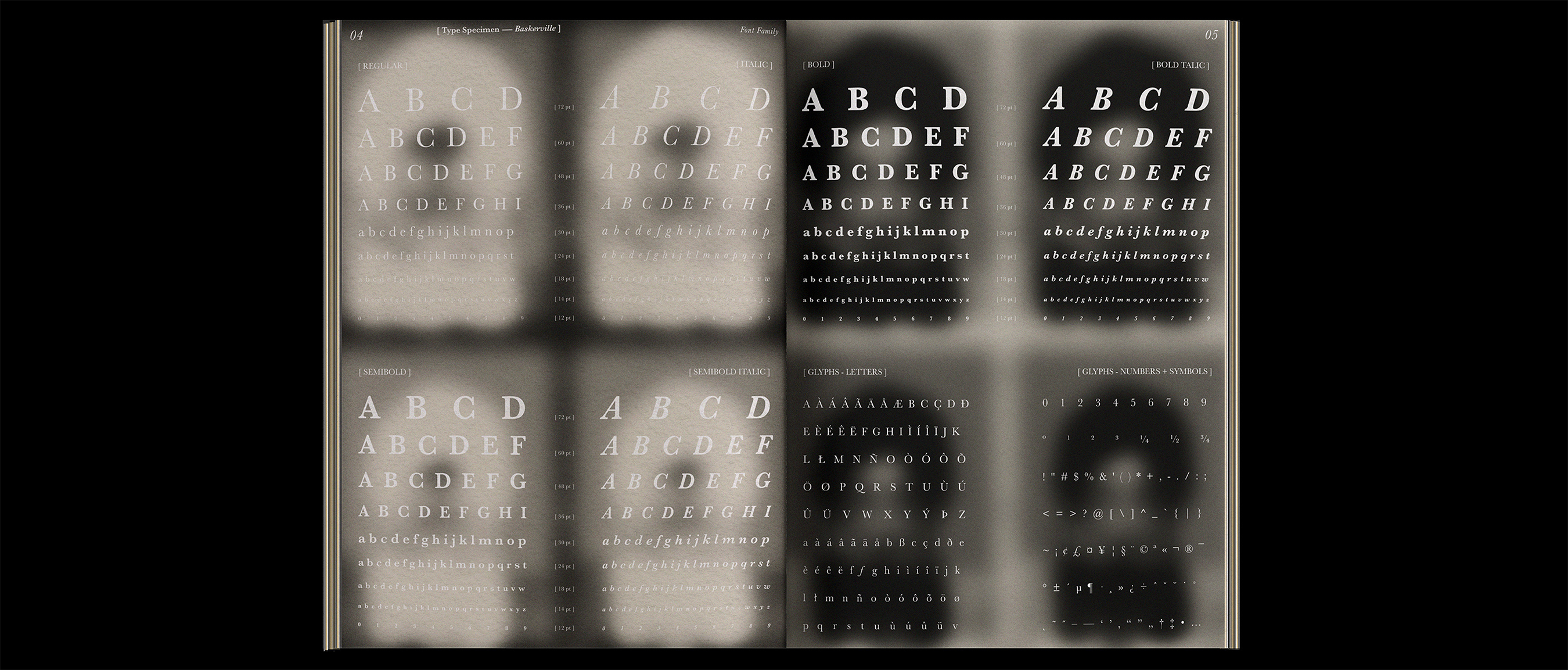 The type specimen showcases Baskerville’s various weights, letters, numerals, characters, glyphs and sizes in use with a relation to Medium Format film photography.
